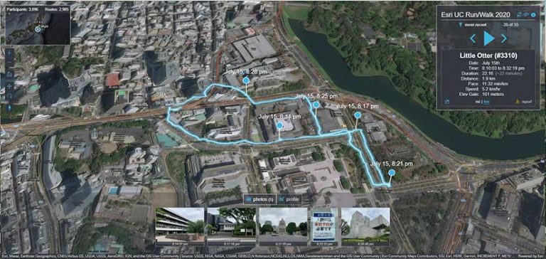 Some trademarked Esri UC events had online incarnations. The Map Gallery, a perennial favorite of attendees, became a virtual showcase of 658 maps on a wide variety of topics and interests, ranging from social justice to Star Wars. A virtual format let many more people to participate in the 5K Run/Walk. In the virtual version, participants from 82 countries used ArcGIS QuickCapture to document nearly 3,400 runs logged during the Esri UC week that added up to 16,634 kilometers. The route of each run was mapped onto a globe for online viewing.
