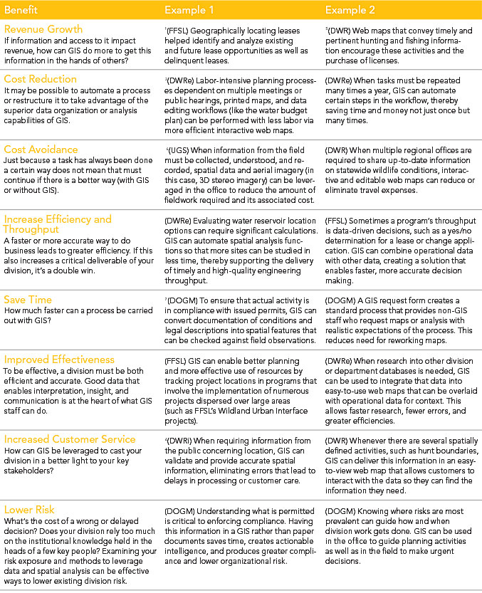 To convey the business benefits delivered as part of DNR’s GIS results documentation effort, I summarized our deliverable benefits (shown in Table 2) and distributed this information to our department and division leadership.
