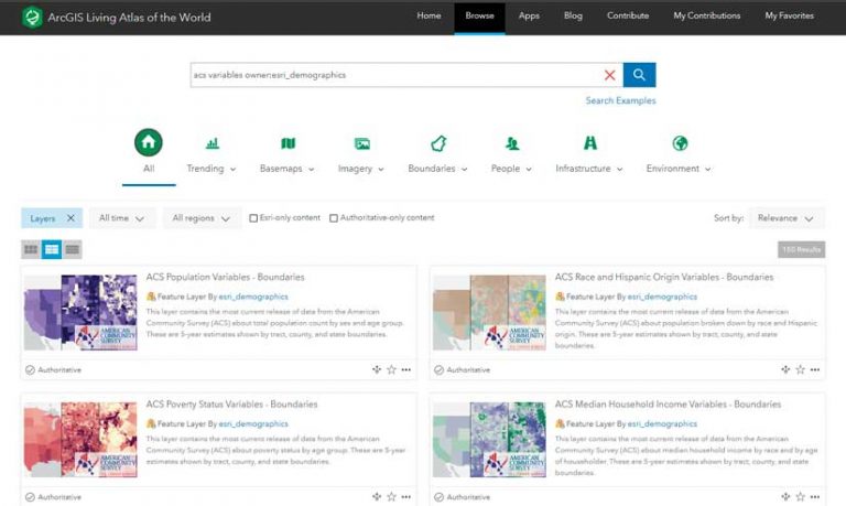 Esri Demographics can be accessed in many ways from ArcGIS products, such as ArcGIS Business Analyst, and via Esri’s ArcGIS GeoEnrichment Service, as well as from ArcGIS Living Atlas. There are thousands of ACS variables available at geographies for states, congressional districts, ZIP codes, census tracts, block groups, and other levels. Custom polygons can also be enriched with the attributes of your choice.