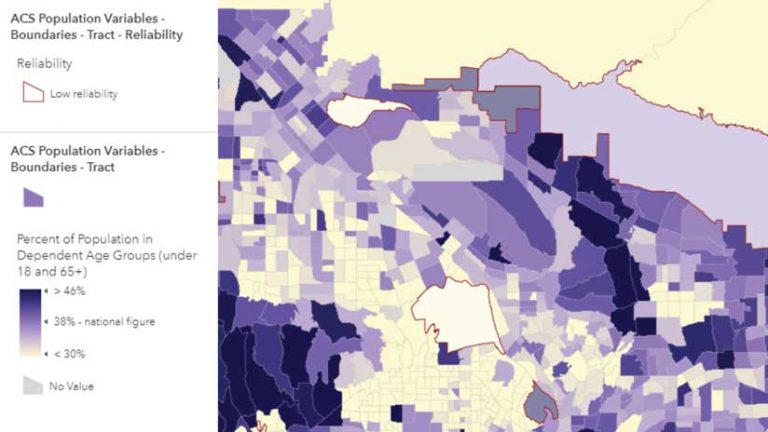The example in Figure 5 uses some of the same techniques as the example in Figure 4 but utilizes an Arcade expression to create custom colors that show the reliability of the estimate. The color is based on the MOE as a percent of the estimate (the coefficient of variation). Arcade helps categorize this percentage into high, medium, or low reliability. (For an explanation of high, medium, and low category thresholds, see the section Using Esri Demographics and ArcGIS Business Analyst.) Note that a disclaimer is included in the pop-up for those unfamiliar with ACS data, and a link to learn more about it.