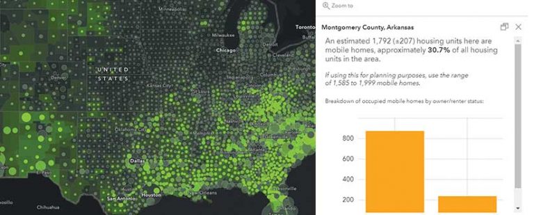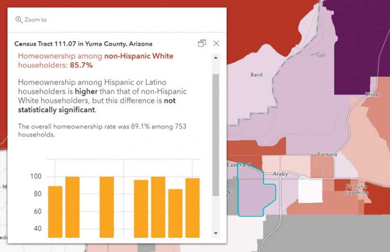 MOEs also help calculate if two things are significantly different. By using the Statistical Testing Tool available from the US Census Bureau, two attributes can be compared while taking into account the MOE associated with survey estimates. The map in Figure 7 uses this z-score method to compare home ownership rates of White non-Hispanic homeowners and Hispanic or Latino homeowners. The pop-up uses an Arcade expression to perform the statistical test on the fly and convert the results into an easy-to-read statement in combination with the Compare A to B mapping style, which maps the ratio between two numbers, expressing that relationship as percentages, simple ratios, or an overall percentage and comparing two patterns both visually and statistically.