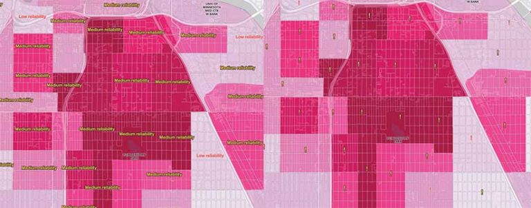 Figure 6 shows various ways labeling can communicate MOEs. These labels are scale dependent, so when the map is zoomed out, the map pattern is not obstructed. When the map is zoomed in to the neighborhood level, the labels become visible and display categorical estimates of the data’s reliability. This map uses the same Arcade statement used as the map in Figure 5 and the label classes that are available in the new Map Viewer.