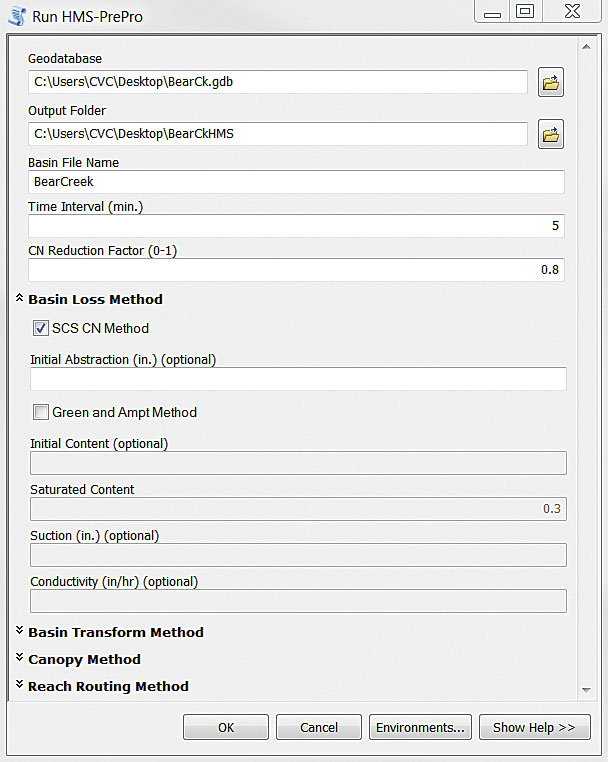 The Run HMS-PrePro script tool performs spatial operations on the database created by the Get Data tool. For widespread applicability, standard hydrologic methods may be chosen to represent basin abstractions, runoff transformation, and reach routing. Watershed parameters from HMS-PrePro should be treated as initial estimates and further optimized with engineering judgment, published resources, and local observations. A description of each hydrologic element is written to an ASCII file, which comprises the HEC-HMS basin model.