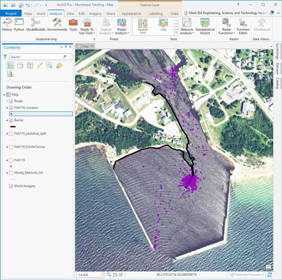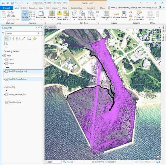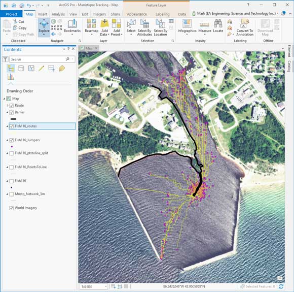 Using the Points To Line tool in ArcToolbox, a massive spider web of lines was generated, covering the harbor and showing the fine-scale movements of an individual carp as it meandered around the harbor during the five-month study. With the lines displayed on an aerial image of the harbor, McCauley discovered where some fish appeared to “jump” back and forth over a large jetty that jutted southward through the center of the harbor.