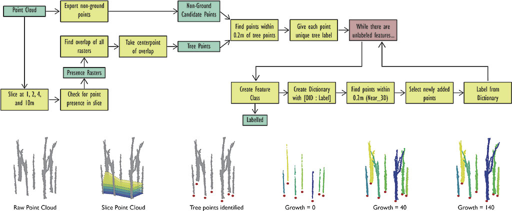 Initially, they considered assigning all above ground points to the nearest tree. This proved to be unsatisfactory because large, spreading tree crowns sometimes overlapped. While more computationally intensive, an iterative growth approach could circumvent this major issue.
