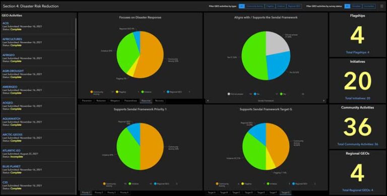 “ArcGIS Survey123 has proven to be a very useful tool that meets the specific needs of our working groups, including the critical ability to capture and communicate the inherently spatial aspect of GEO’s efforts and impact around the world. For the GEO DRR-WG, the collected data informs us where we should focus our efforts during the coming year,” Borges said.