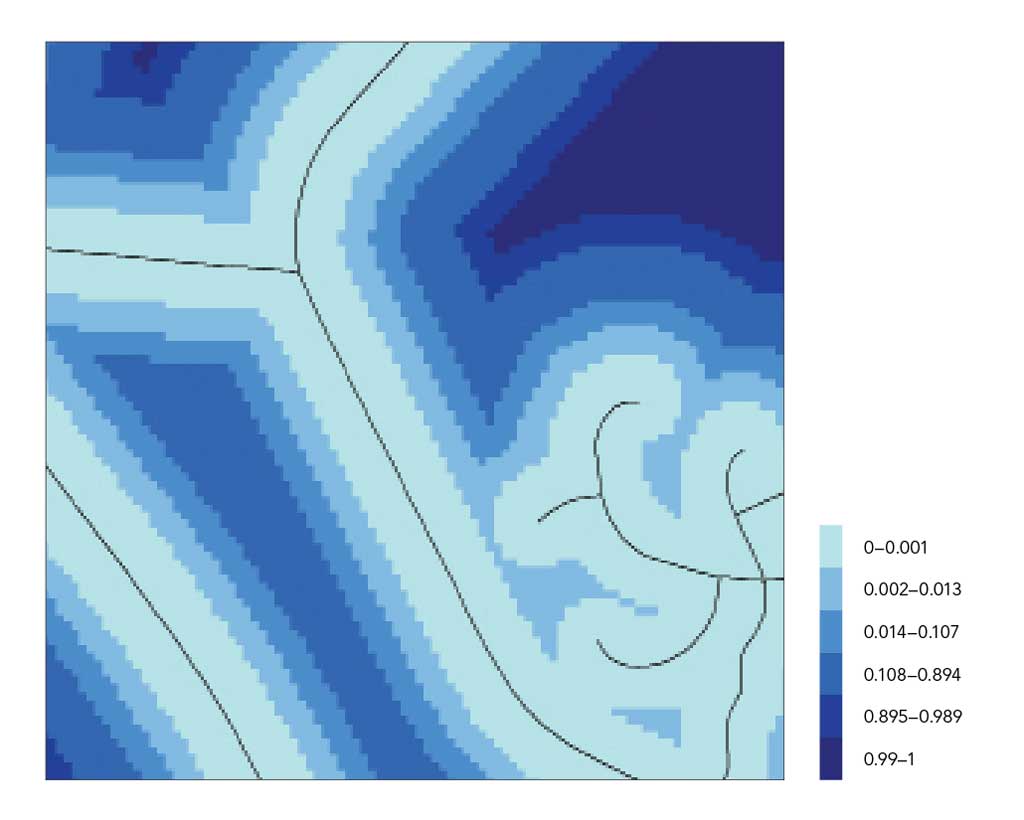 However, in an urban county, such as Summit County, which has a dense road network, these parameters would exclude most of the county. As a compromise, the Euclidean distance to the nearest road was calculated, and the distances were rescaled using a sigmoidal function shown in Figure 4a. The effect of this function is that locations close to a road (0–50 m) will have a very low suitability. Once the distance from a road reaches 50 m, suitability begins to gradually increase. When the distance reaches approximately 250 m, suitability levels off and all distances greater than this distance are nearly equally preferred (as shown in Figure 4b).