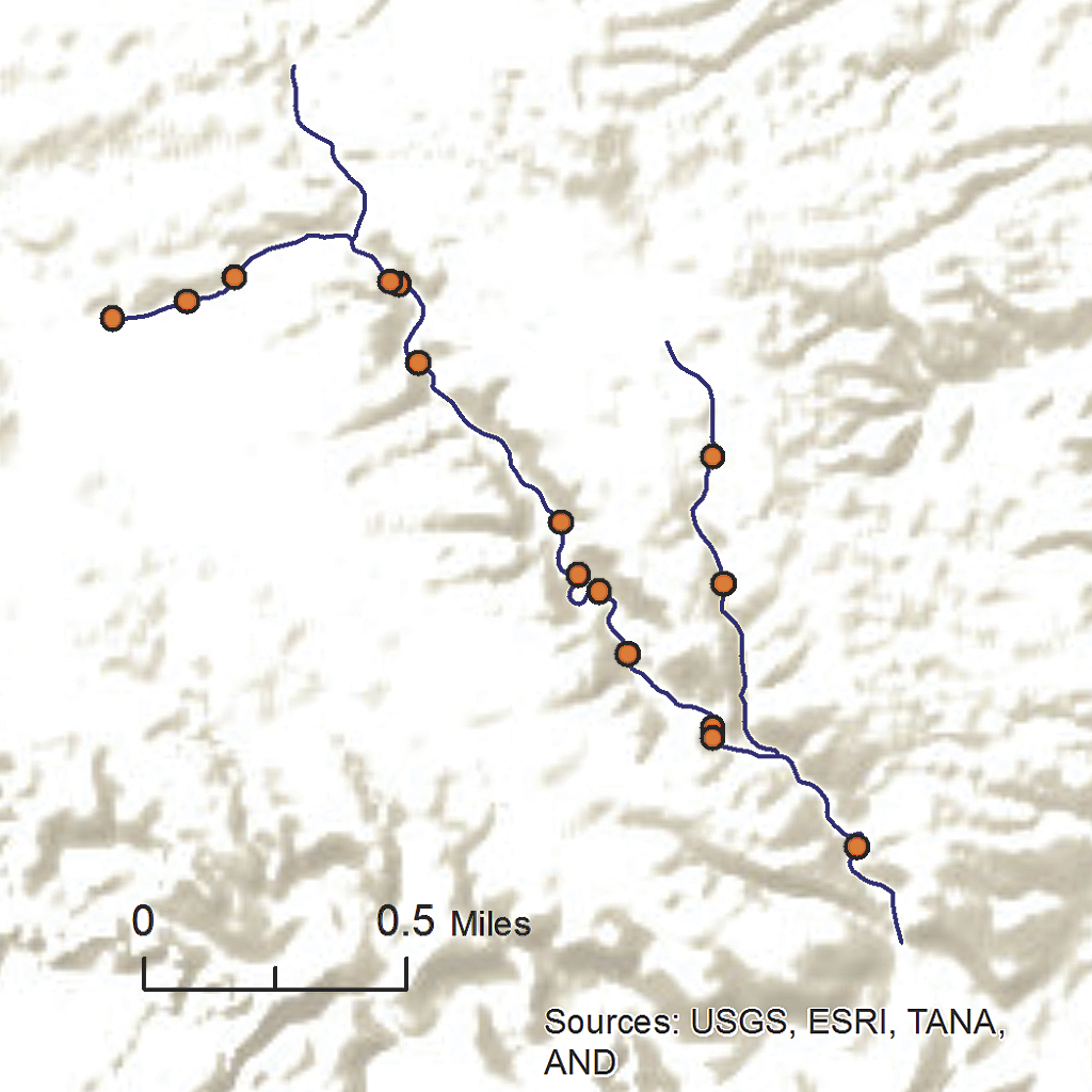 This workflow can be used for other applications such as locating sampling sites along a stream or road network, which is often a difficult task in GIS. Using the Feature To Raster tool (Conversion toolbox), the road or stream network can be converted to a raster, and locations on the stream or road can be assigned a value of 1 and all other locations assigned a value of 0. Using this raster as input to the Create Spatially Balanced Points geoprocessing tool results in a random sample of points along the network (Figure 6a). Alternatively, locations along the stream or road could be given higher inclusion probabilities based on proximity to features such as dams or environmentally sensitive areas.