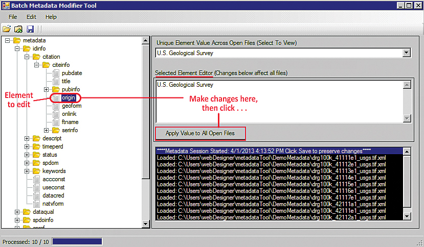 The metadata structure for a file or many files is presented as a hierarchical tree in the left-hand window. The user can navigate through the tree and examine the values of each element, which are listed in the Unique Element Value Across Open Files drop-down menu on the left. The user can edit the value in the window below it, and then, if desired, replicate those changes across all similar elements in all open files. The Batch Thumbnail Creator Tool is similarly simple to use. A user can open a single file or group of files via the ArcCatalog Contents Tab to generate thumbnails.