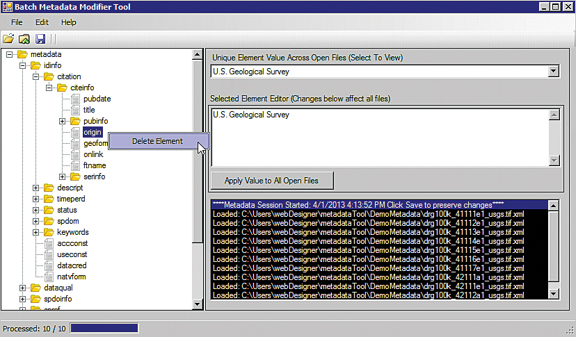 Iteration capabilities are imperative when the task at hand involves applying identical updates to large batches of files. The Batch Metadata Modifier Tool is simple to use and eliminates the need to perform protracted, mundane repetitions of identical operations on multiple files individually. A user can open a single file or group of files via the ArcCatalog Contents Tab to modify existing elements, find and replace element content, delete a metadata element, or import metadata elements from external templates.