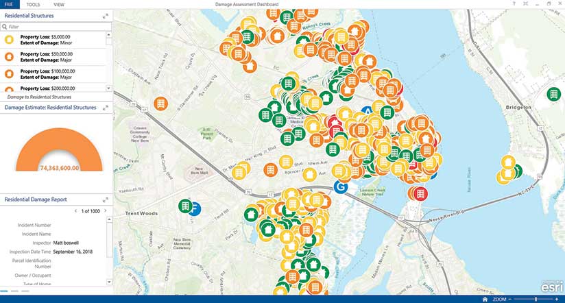 Located near the coast at the confluence of two rivers, New Bern was about 90 miles from the hurricane’s point of impact. The city had prepared for big storms before. Two years ago, when Hurricane Matthew—initially a category 5 storm—was forecasted to roll through the Carolinas, the city set up Esri’s Damage Assessment configuration of Collector for ArcGIS to help emergency responders keep tabs on field resources and conduct damage assessments. But Hurricane Matthew turned back into the Atlantic Ocean after making brief landfall as a category 1 storm in South Carolina, and New Bern was spared.