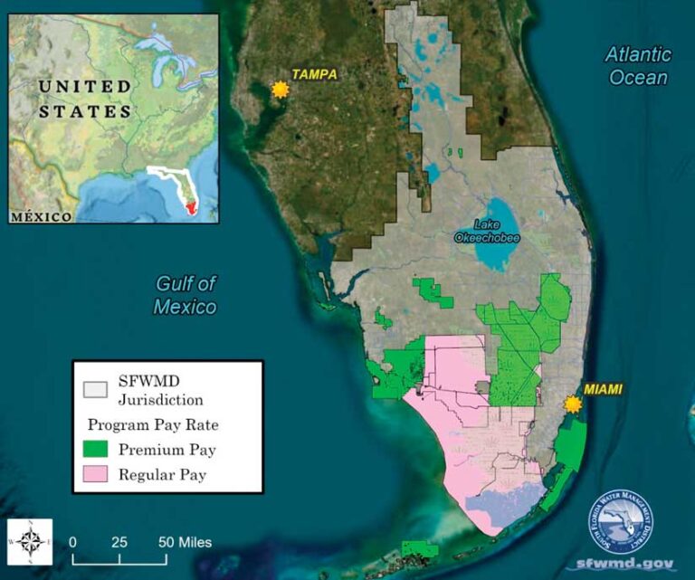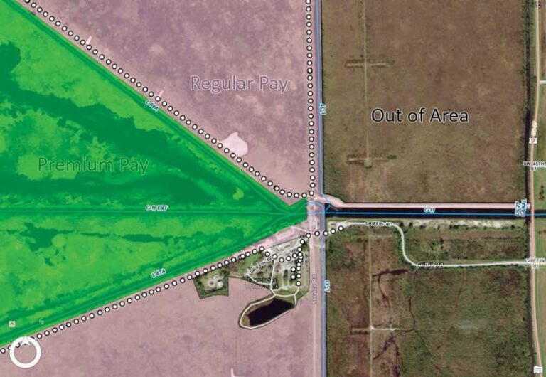 To address the spatial component of pay rates, agents select a hyperlink from their survey to open ArcGIS Field Maps to view their location with an overlay showing areas that pay the regular hourly rate and areas that pay a premium rate. If removal agents turn on My Tracks when they operate within the project area, their track point data is spatially intersected with a highly detailed delineated program lands polygon layer. That layer is maintained in ArcGIS Pro by Heather Kostura, SFWMD geospatial data supervisor.