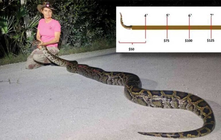 With a large reproducing population and almost no natural predators, Burmese pythons have become one of the most destructive invasive species within Everglades National Park and the surrounding natural areas. According to a 2011 journal article in the Proceedings of the National Academy of Sciences (PNAS), road survey observations of mammals throughout southern Florida show a dramatic decline in raccoon, opossum, and bobcat populations, and these findings suggest the decline is due to predation by Burmese pythons.
