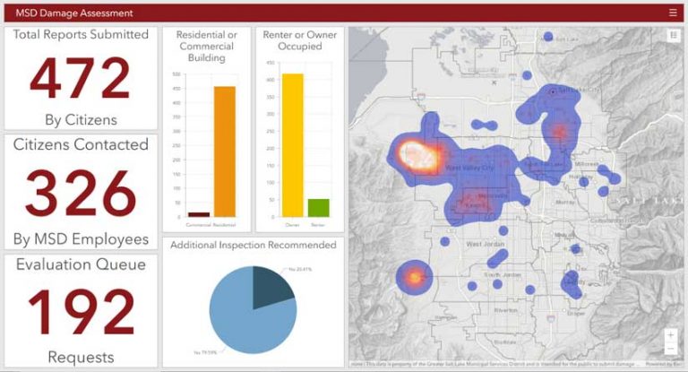The Greater Salt Lake Municipal Services District (MSD) oversees planning and development services in Magna, including building inspections. The MSD Operations team quickly created data collection forms in ArcGIS Survey123. The forms helped the public report damage and field inspectors assess structural integrity. MSD building inspectors partnered with Salt Lake County Public Works structural engineers to triage the damage and more effectively direct response efforts throughout the jurisdiction.