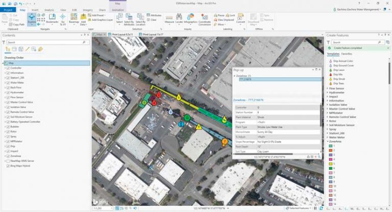 The information in the geodatabase, created in ArcGIS Pro, is published as layers that are hosted in ArcGIS Online, where Gachina staff can call up a client’s irrigation map, click on a zone, and view a pop-up containing pertinent information associated with each zone. That information helps staff determine the amount of water each zone in the site receives.