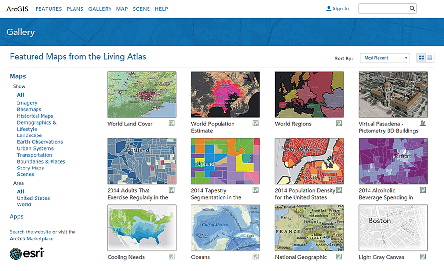 Over the past few years, Esri has been expanding the types of content that it makes available through the Living Atlas. Maps cover a wide range of topics related to people (human systems), the earth (physical systems), and life (natural systems). Human systems content includes demographic and lifestyle maps for the United States, Canada, and more than 120 other countries. A wide assortment of Esri Story Map apps, categorized by topic, can be accessed from the Living Atlas. Layer content includes multispectral imagery, elevation layers, and ecological land units.