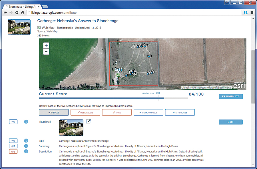 Each item being evaluated for nomination is given a score based on the presence of key elements, such as the summary, description, and custom thumbnail, and characteristics such as drawing performance, cartography, and other characteristics. An item must have a minimum score before it can be nominated for the Living Atlas. Scoring before nominating eliminates numerous emails and phone calls between the item’s owner and the Living Atlas curator.