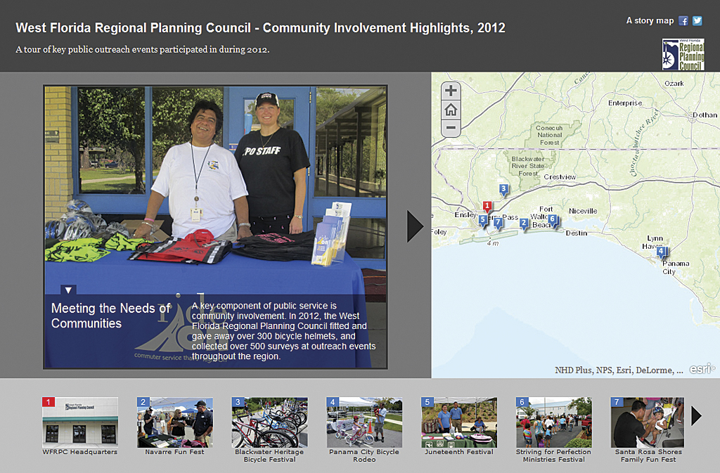 The West Florida Regional Planning Council holds numerous events that promote community involvement. This story map highlights the events the council held in 2012 in a way that makes a connection between the people and places where these events occurred.