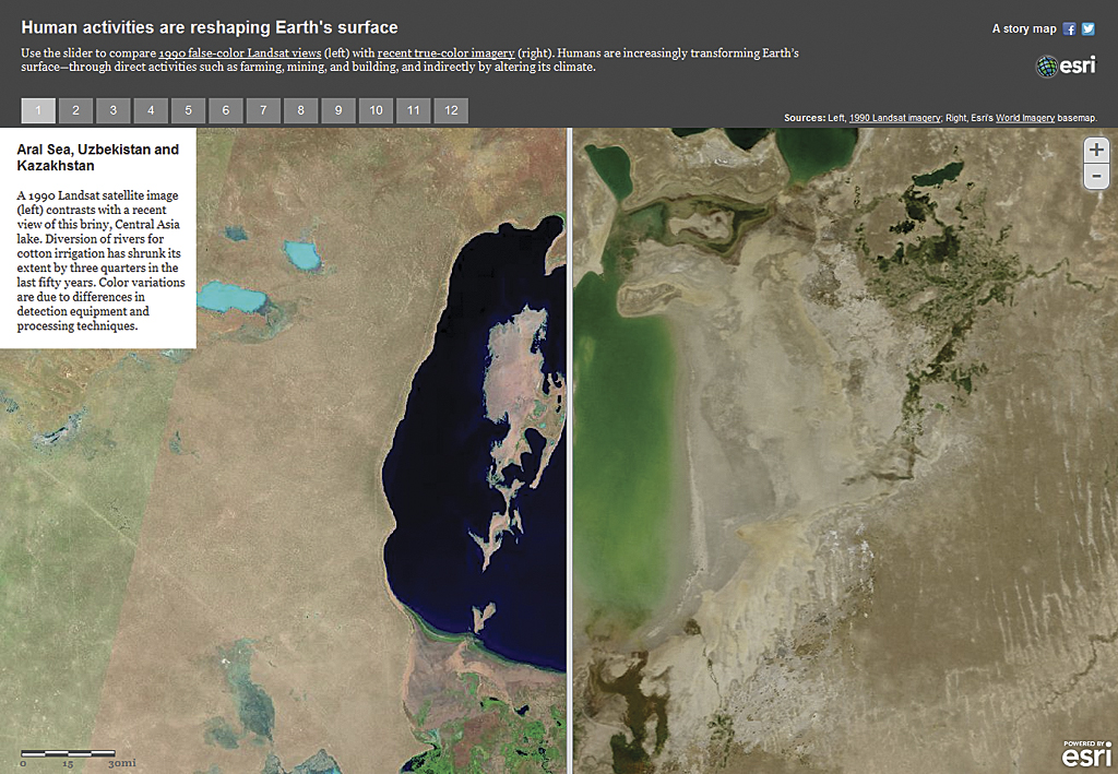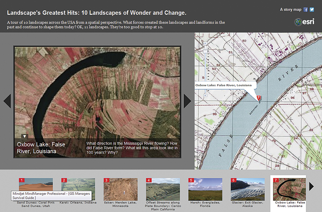 A constantly growing collection of free story map templates are available at the Storytelling with Maps website. Currently, templates that create tours, map matrixes, multipaned comparison displays, and sidebars exist. The Esri Story Maps team is continually developing new templates that refine map-based functionalities and user experiences.