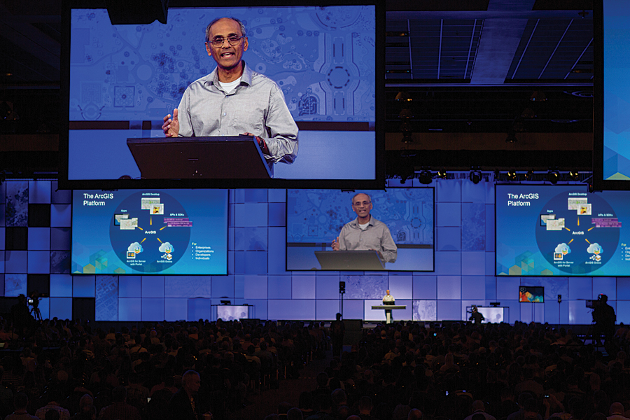 Esri director of software development Sud Menon spoke about what the ArcGIS platform does for developers, including creating maps and authoring apps to share with users.