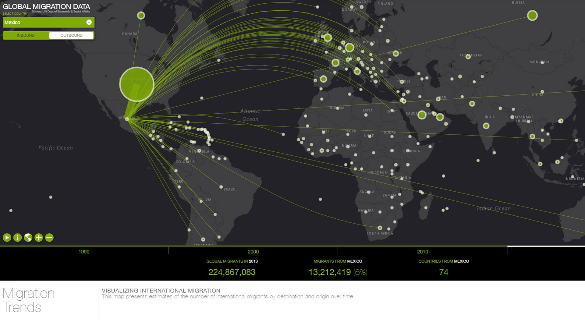 The Esri Cool Maps gallery features this 2D and 3D map visualization of incoming and outgoing migration, organized by country, for four different time periods. The map below presents estimates of the number of international migrants by destination and origin. The map uses a dataset, called Trends in International Migrant Stock, from the United Nations Department of Economic and Social Affairs.