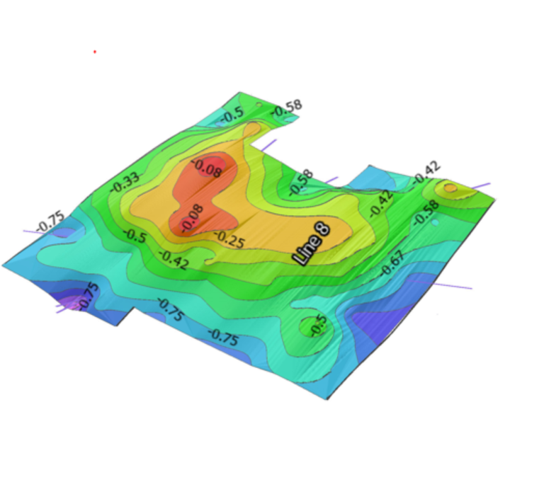 With the home survey measurements, 2-10 engineers use the tool to draw lines across the elevation model. These lines help engineers determine the most significant foundation deflections and tilts. The engineers then generate a custom report with easy-to-read graphs, tilt and deflection ratios, and offset calculations for deflection using the computations and imaging that the program creates.