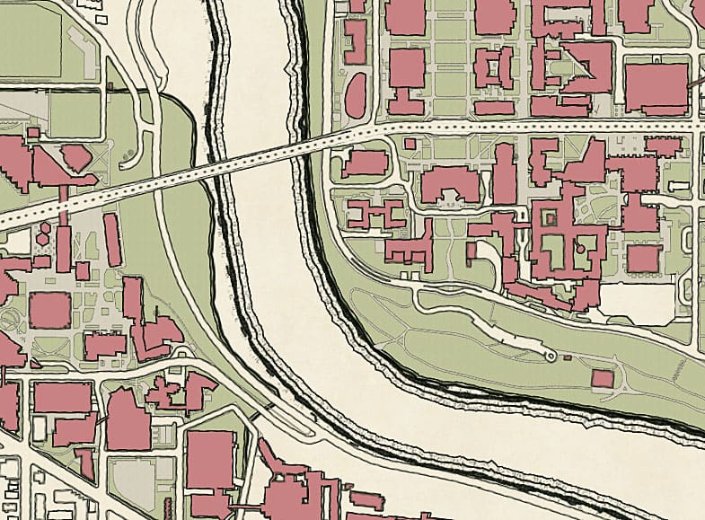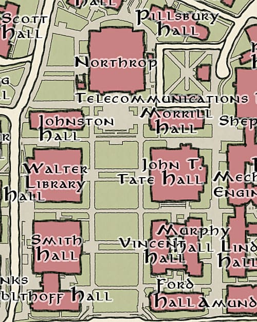 Most of the time I am working on web maps or other maps where cartography does not necessarily play a very big role. Wanting a new creative challenge, I approached my boss Daniel Sward, GIS coordinator for University Services, and told him I wanted to make a pretty map and expand on my map design skills. Eager to help me fulfill my goals, he quickly gave me a suitable task. He told me that the assistant vice president of our department, Brian Swanson, wanted a nice-looking map of the University of Minnesota Twin Cities campus to hang in his office, and that this could be my cartographic project. That was the extent of the instruction: “nice-looking.” I could do whatever I wanted. But there was a problem: I had no idea how to make this campus map look special or different from what we normally do.