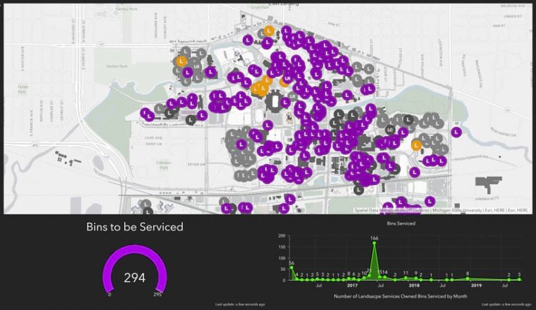 For the answers, Lawver’s team sought a technology-based solution that leveraged location-based data. Lawver contacted Jade Freeman, GIS coordinator for the spatial data management team in the MSU IT Analytics and Data Solutions department, who used ArcGIS technology from Esri to allow landscape services staff to collect data on the bins and analyze which bins were underutilized.