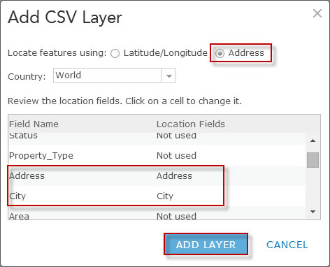 , then click and drag it onto the map from the folder in which you saved it. - Note that the address locator will be used with the Address and City fields in the CSV file to find the point locations. Click ADD LAYER.