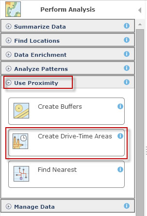 Click Perform Analysis to access the various spatial analysis capabilities. - Click Use Proximity and then click Create Drive-Time Areas.