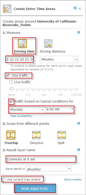 - You can also use traffic information to refine the drive-time areas based on current traffic speeds referenced from sensors and predicted traffic speeds that are calculated by referencing live traffic feeds, historical speeds, and current events such as weather. Traffic speeds are predicted 12 hours into the future, so you can move the slider to set the departure time ahead by up to 12 hours. Click the Use traffic option and use traffic data based on conditions typical for a Monday at 8:00 a.m. Change the resultant layer name to Commute at 8:00 a.m. Uncheck the option to use the current map extent and then click RUN ANALYSIS.