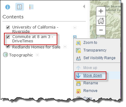- Zoom out to see the full extent of the drive-time areas. Click the arrow to the right of the drive-time areas layer in the contents and click Move down so that it is easier to see the points.