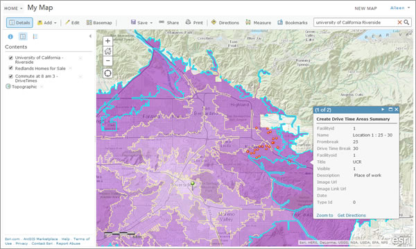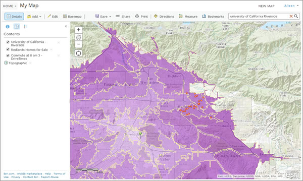 Esri ArcGIS Online can help to create drive-time areas based on fixed speeds or traffic conditions using a specific departure time. Doing this type of analysis can help prospective homebuyers narrow their choice of cities or neighborhoods.