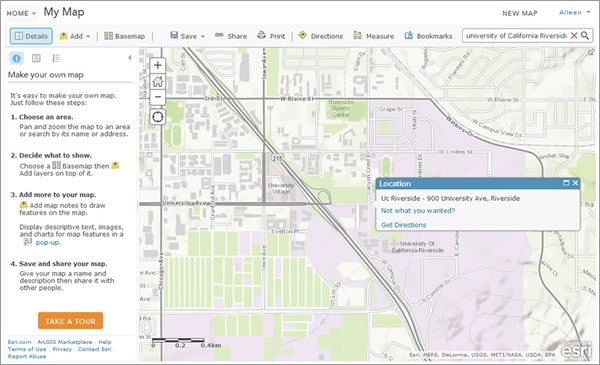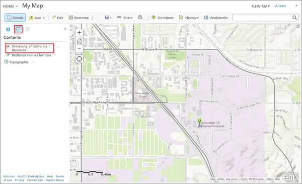 After adding points from a CSV file to a map, the display automatically zooms to the extent of the data. - Find the work location by typing “University of California Riverside” in the search box at the upper right of the screen. The drive time will be measured from this point along roads to create the areas. The map will zoom to the location you specified.