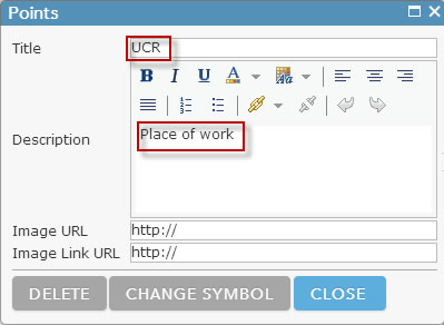 The symbol you choose will be added to the map. Name the location in the title and, if you want, add a description, then click CLOSE. The symbol will be added to the map.