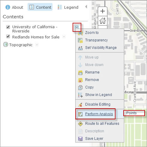 In this example, a person is thinking of buying a house in Redlands, California, and will commute to work at the University of California in Riverside. Creating multiple drive-time areas from the university will show homes that have a range of commute times. The analysis will specify 8:00 a.m. on Monday, a typical time and day to commute to work.