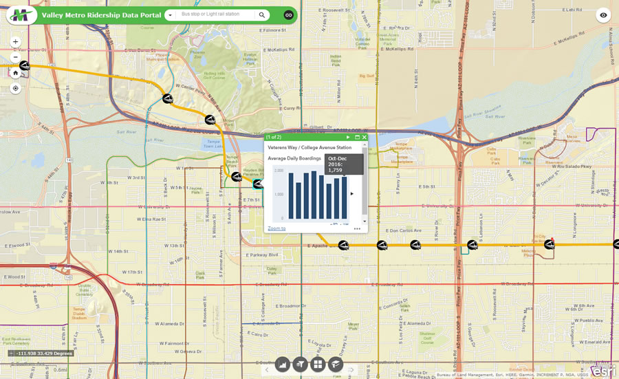 “Valley Metro provides public transit service to 16 different jurisdictions in the Phoenix area. Open Data provides the most efficient means of [giving] each of these jurisdictions—as well as the public—accurate and authoritative transit-related GIS data.” said Cory Whittaker, GIS administrator for Valley Metro.
