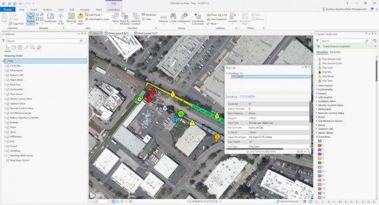 To help manage irrigation water usage and get the details needed to program each irrigation controller to be waterwise, Sutton and Gutiérrez in late 2014 and early 2015 began to use ArcGIS Pro 1.0 beta to start the process of creating a geodatabase schema for the data the company collects for each zone at clients’ sites, then customized that schema with features, layers, symbology, and attribute values. Some attributes in the geodatabase include plant type (e.g., shrub, lawn, ground cover); high, moderate, and low water use based on the plant material; controller; station number; microclimate (e.g., sunny all day); slope percentage; soil type; root depth; sun and shade exposure; various valves; the names of the irrigation pipe manufacturer; and types of sprinklers or drip irrigation systems. More detailed information can be added in the notes field, such as the names of the plants or flowers in each zone. Gachina does not map the location of individual sprinklers unless a premium service client makes that request.