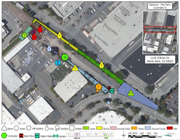 Most clients receive a PDF of their irrigation map for their property, showing in different colored polygons the types of plant material on the property and irrigation on the property, along with the location of controllers, water meters, and backflow prevention devices.
