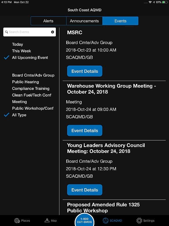 In addition, Moskowitz thought the app should be easy to navigate, contain pertinent information, and provide people with a way to connect with South Coast AQMD either by reporting air quality issues using the 1-800-CUT-SMOG number or easily finding the times and locations of South Coast AQMD meetings they could attend.