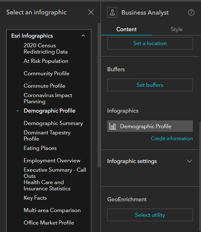 Step 11: Under Infographics, click Select an infographic. From the populated panel to the left select Demographic Profile.