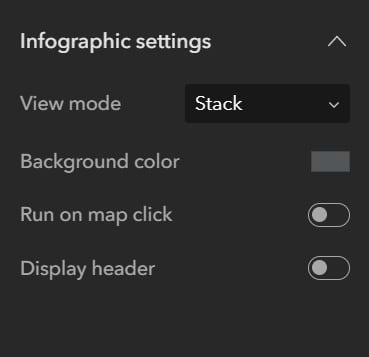 Step 12: Configure the infographic settings using the drop-down menus under Infographic settings. Select Stack view mode and turn off both the Run-on Map click and Display Header toggle buttons.