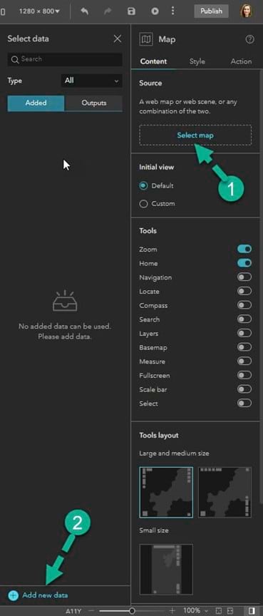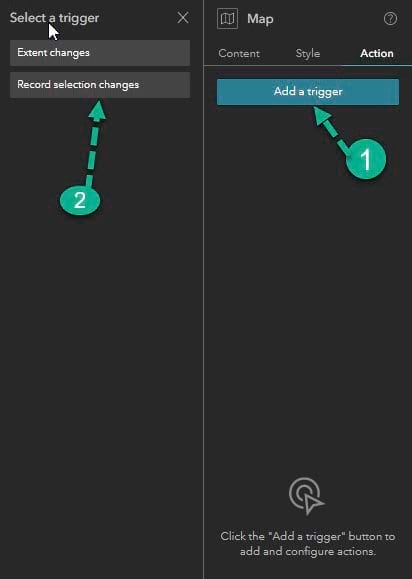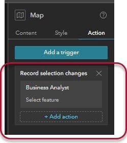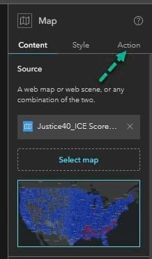 Step 13: Click the Map widget panel, then select the Action tab on the right panel.