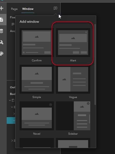 You can also configure the Alert widget to provide information and instructions about the application. To do this, click the Page icon on the left panel. Click the Window tab and then click the Add Window icon at the upper right side of the panel. In the add new window panel, click Alert.