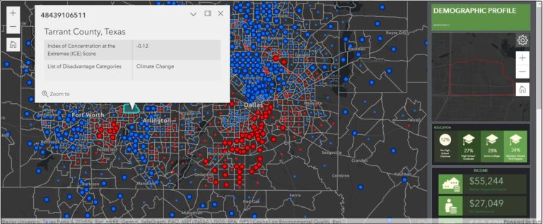 Now you can publish the web application. Once you have published this web app, viewers can click census tracts on the map to learn about the degree to which Justice40 categories of disadvantage prevail—or not—in areas of extreme residential concentration as well as key demographic information.