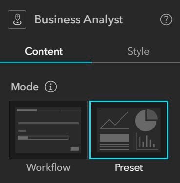Step 9: Click the plus sign in the top left corner to open the Insert widget panel. Drag the Business Analyst widget from the Insert widget panel onto the app. Click Preset mode on the right panel.