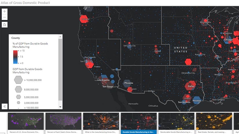 Use the Atlas of Gross Domestic Product app in the ArcGIS Living Atlas to view gross domestic product (GDP) information in the United States,