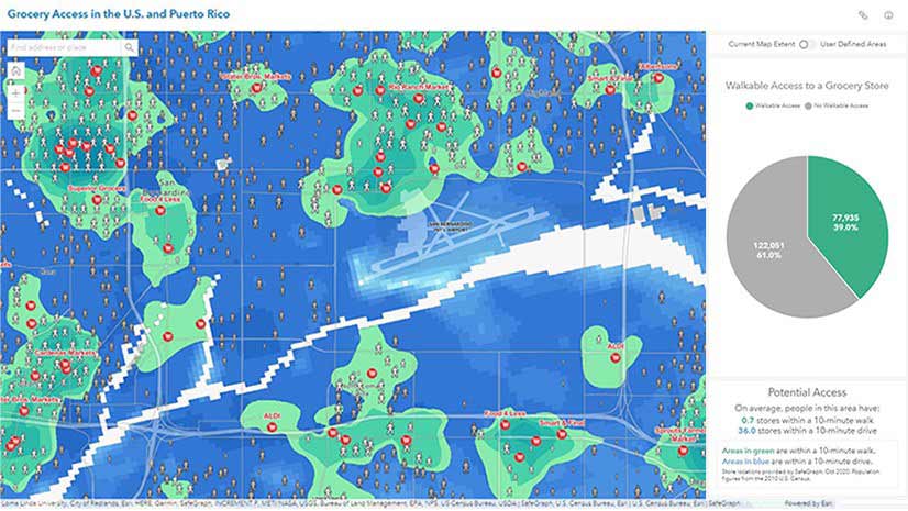 This map shows which areas are a 10-minute walk or 10-minute drive from a grocery store in the United States and Puerto Rico.