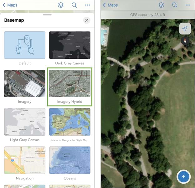 You can collect your example data anywhere, but if you are able, walk to a nearby park. Before you start collecting data, you’ll change the basemap so it displays satellite imagery. This can be a helpful reference when adding new data to a map.
