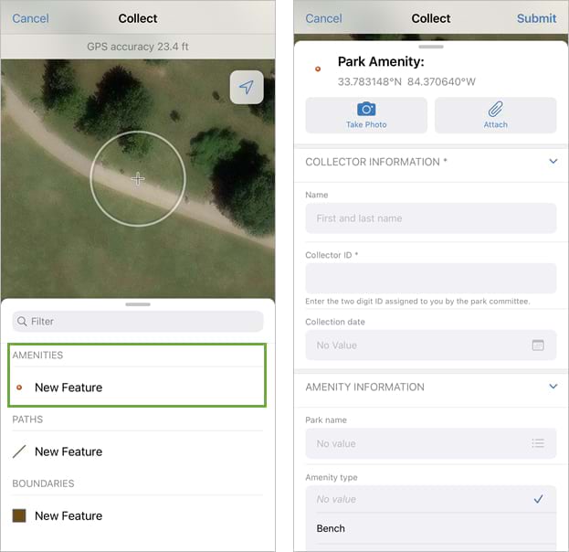 Step 7: Under Amenities, tap New Feature to open the form configured for the Amenities layer.
